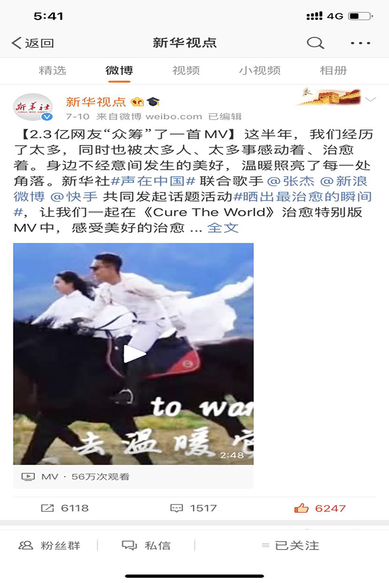 传播与经管学院2020届广告学专业毕业生陈雅玲剪辑制作的《Cure the World》治愈版MV,7月10日在歌手张杰和新华社的微博、快手上发表。截止到今天为止,新华社快手号已经有1163万以上播放量、114万以上点赞。张杰微博播放量也已经达到180万以上的播放量。