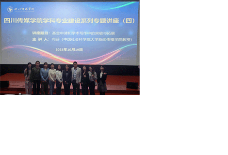 为进一步加强学术经验交流,提高学科专业建设,不断提升教育教学质量。四川传媒学院于10月19日在音视频创意中心成功举办了学科专业建设系列专题讲座的第四场活动,此次讲座由四川传媒学院科研与发展规划处、人事处主办,传播与经管学院承办,四川传媒学院传播与经管学院教学副院长金佳林担任主持人,特邀中国社会科学院新闻与传播研究所研究员向芬为师生们带来了题为“基金申请和学术写作中的突破与拓展”的精彩讲座。在此次讲座中,向芬研究员结合自身学术科研经历以及我校各位师生的学术发展目标,为大家深入分析了基金申请过程中的需注意的各类事项以及学术写作过程中如何进行突破与拓展。