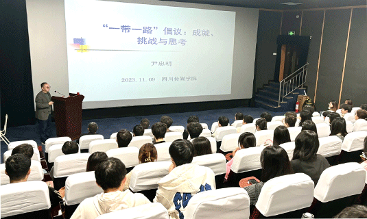 尹忠明教授对“一带一路”倡议的概况、十年以来取得的成就、“一带一路”倡议的国际评价、面临挑战、未来发展方向等方面作出了深入的分析,并特别展示了四川乃至西南片区在“一带一路”倡议背景下所取得的成果,使在场师生对“一带一路”倡议有了更为全面的认知。另外,尹教授还向在场师生介绍了“一带一路”相关研究的现状、问题与展望,给师生们在研究方向、研究方法方面等方面带来了许多突破性和创新性的启示。