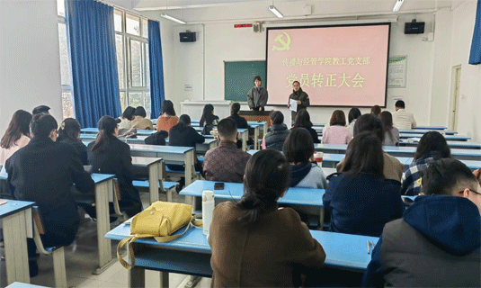 2024年3月20日,传播与经管学院教工党支部在A02-413召开党员大会,研讨预备党员何博同志按期转为中国共产党正式党员事项,会议由教工支部书记赵玉文主持。