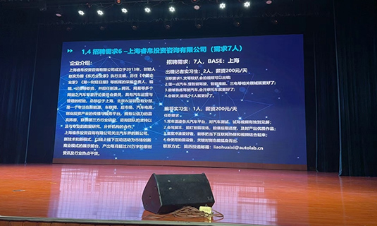 最后,李老师提出为大学生提供岗位招聘的可行性和必要性,此举有助于缓解大学生就业压力,同时也有助于企业吸引优秀人才。呼吁同学们要充分认识到每一个岗位都是一个锻炼和提升自己的舞台。要勇敢地迈出第一步,积极参与各类招聘活动,展示自己的才华和潜力。此外我们也要学会在招聘过程中不断总结经验,提升自己的综合素质和竞争力。在求职过程中,不能盲目跟风,也不能随波逐流。要结合自己的兴趣、特长和专业背景,选择适合自己的岗位和行业。只有这样,我们才能在未来的职业生涯中充分发挥自己的优势,实现个人价值和社会价值的双赢。并向同学们展示了6家复旦校友企业,岗位需求65-72人,详细介绍了此次招聘岗位的种类、数量、以及相应的薪资待遇和福利。