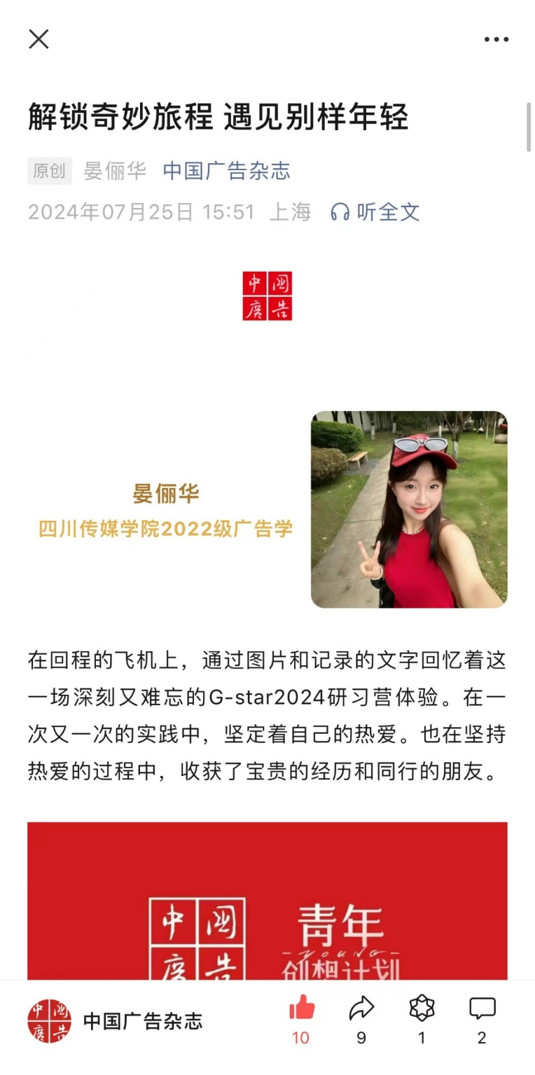 2024年7月18日至19日,我院广告学专业2022级学生晏俪华受邀参加了由中国广告杂志和省广集团共同举办的G-star2024研习营,并在研习营结束后受到《中国广告》杂志社的邀请,以本次研习营的学习过程和体会为内容,撰写了题为《解锁奇妙旅程遇见别样年轻》的文章,文章内容刊登在《中国广告》杂志。 此次研习营活动的学员是《中国广告》杂志社从华釜青年奖的参赛选手中择优选出,参加此次研习营活动的学员共20人。 据悉,“G-star研习营”是由省广集团联手华釜青年奖推出的活动,旨在搭建企业与青年之间的沉浸式沟通桥梁,促进广告学专业的多方破圈、产学研创新融合,实现与热爱广告行业高校学生的双向奔赴。