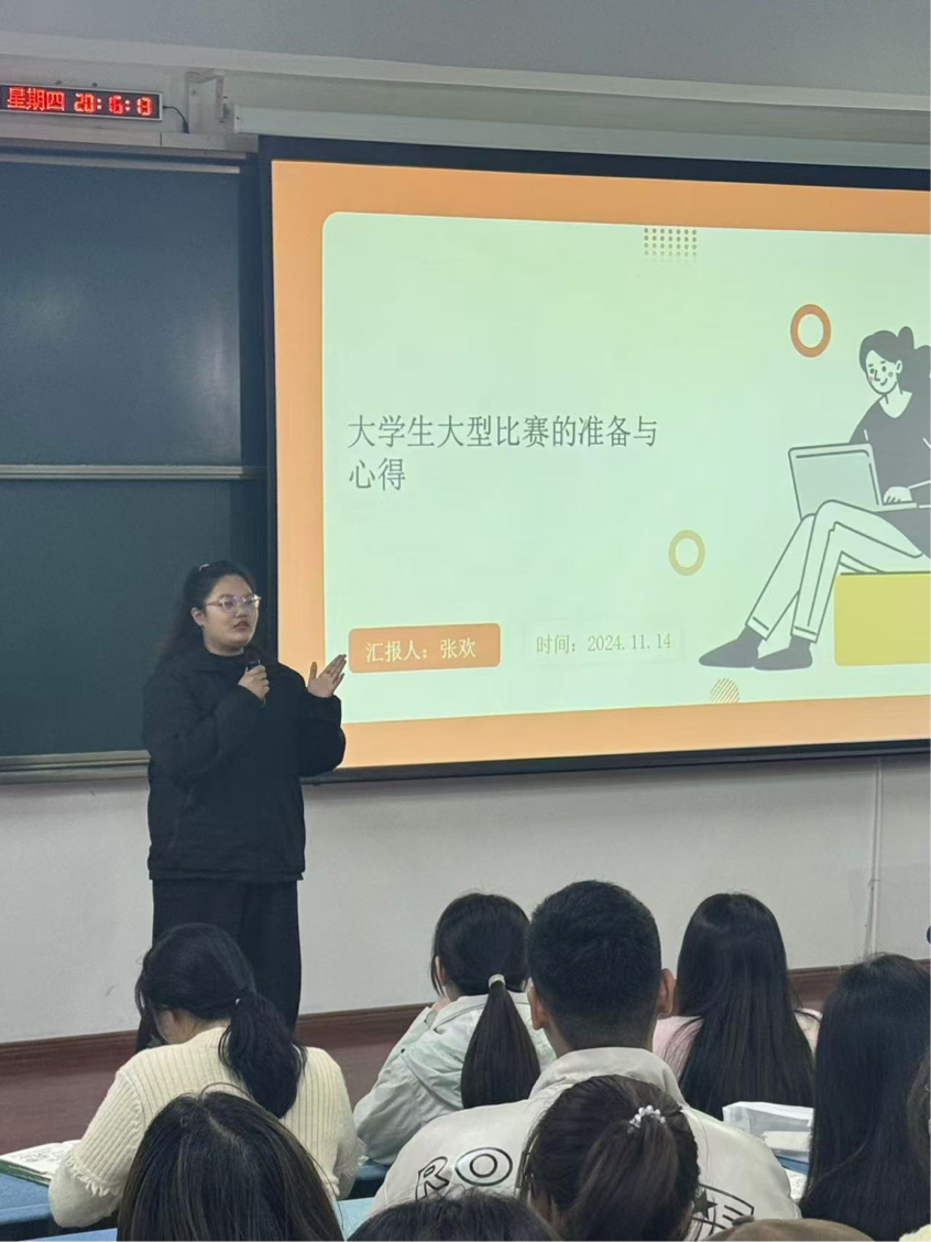 优秀参赛代表张欢同学就自身参赛经历进行心得分享,她着重指出,参赛组队一定要综合多专业一起,不建议只在一个专业里组队,要有敢闯,敢问,敢为的心态。