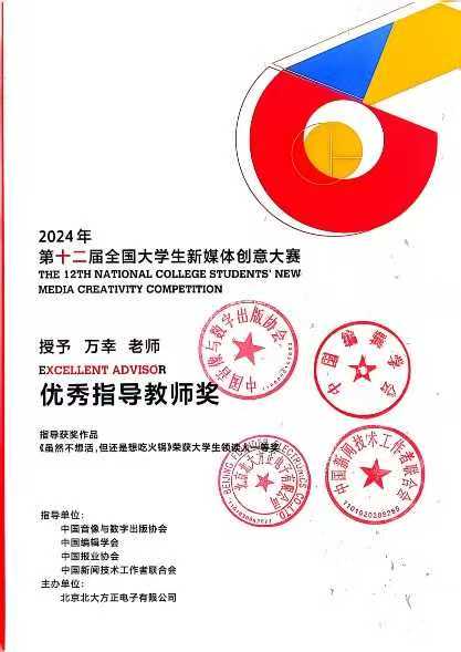 2025年3月20日,第十二届全国大学生新媒体创意大赛在北京外国语大学举行颁奖盛典。当晚,星光熠熠,大学生领读人与出版人面对面、分享获奖作品。我校传播与经管学院一组学生作品在“文学校园・寻找大学生领读人”阅读推荐短视频创作赛项中脱颖而出,荣获一等奖,指导教师被评为优秀指导教师,充分展现了学院在新媒体实践教学领域的突出成果。