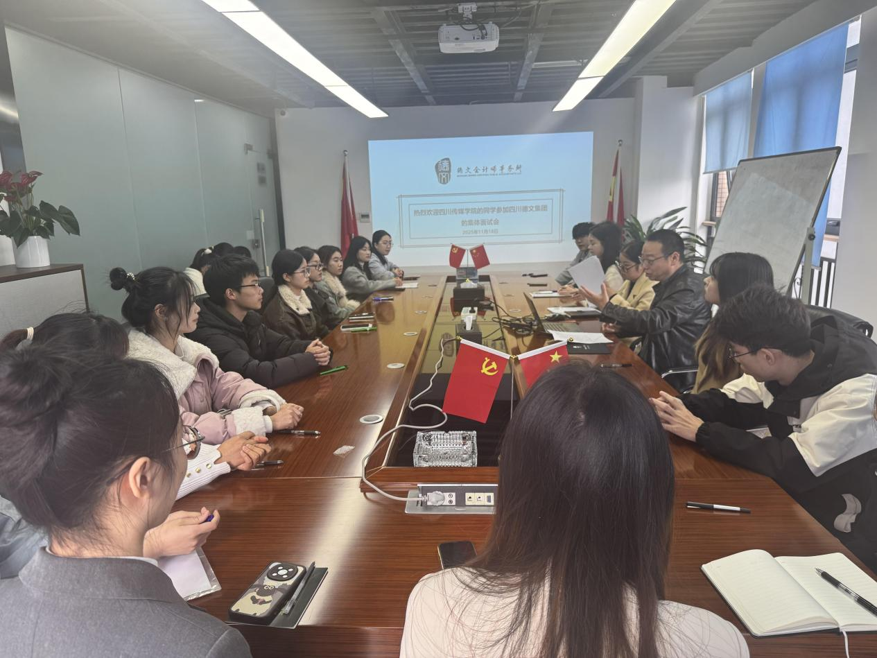 2025年11月18日下午,四川传媒学院传播与经管学院与四川德文会计师事务所(特殊普通合伙)联合举办的大三学生专场实习面试会顺利举行。本次审计寒假实习生集体面试由事务所合伙人杜志勇亲自主持,我院财务管理等专业的14名学子怀揣职业理想,积极参与角逐,展现了学院在应用型人才培养方面的扎实基础与前瞻布局。